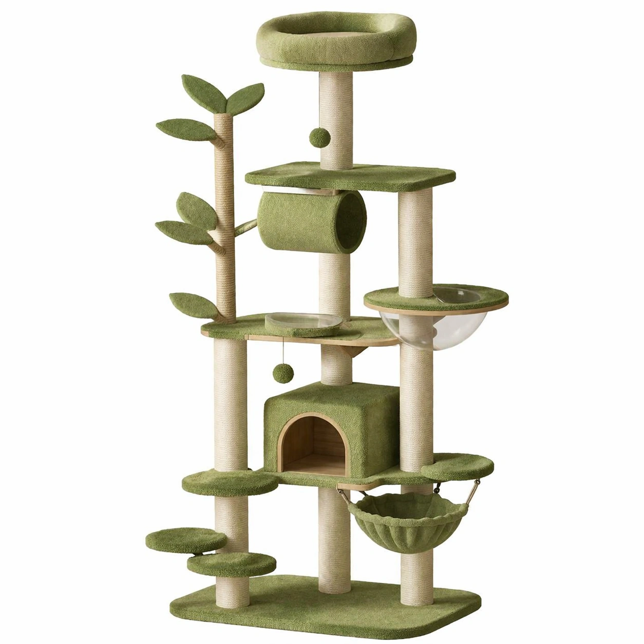 Tiene varias plataformas para trepar, un tubo de juego, una cueva de descanso, un nido colgante de tela y un bol de acrílico transparente de 5 mm. La altura total es de 180 cm, con un ancho de 60 cm y una profundidad de 50 cm. Puede soportar el peso de varios gatos simultáneamente.