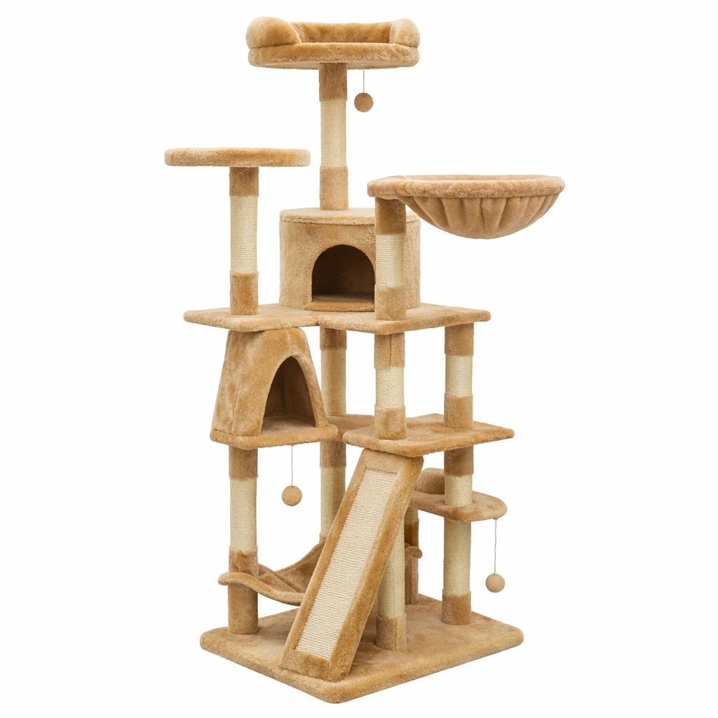 Incluye múltiples plataformas, casitas, postes de rascado y juegos colgantes. Componentes utilizables: Plataforma superior, hamaca, rampa y varios postes de rascado.