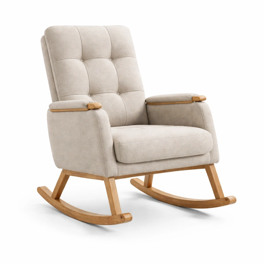 El sillón mecedora cuenta con una estructura de madera maciza y está tapizado en tela de lino. Las dimensiones son 105 cm de alto, 65 cm de ancho y 85 cm de profundidad. La altura del asiento es de 45 cm. El color principal es Beige.